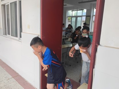 接着,各班有序组织疏散逃生演练。该项演练是模拟在火灾、地震等紧急情况下,学生按照各班规定路线快速疏散至安全区域。各班学生使用湿毛巾捂住口鼻,低身弯腰,迅速撤离到操场指定位置上,各班在5分钟内完成撤离。
