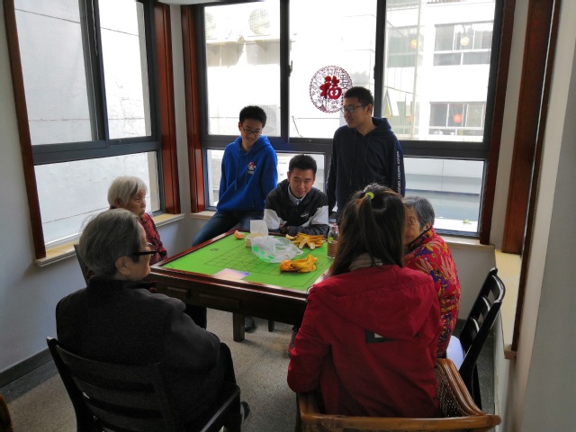 上午8点,志愿者们准时在学校北门集合,他们提着准备好的橘子、香蕉并在负责人的带领下来到了金山村博济敬老院。来到敬老院后,志愿者们首先热情地问候了老人,老人也因为志愿者们的到来而脸上情不自禁地露出了笑容。博济敬老院的负责人在了解到志愿者们此行的目的后对他们的到来也表示十分欢迎。志愿者们在大致了解了敬老院的情况后,在负责人的组织下分成了几个小组,每组两到三个人,拿着橘子和香蕉进入老人们的房间。志愿者们在房间中认真倾听着老人讲述他们过去的故事,满足了老人们回忆往昔的愿望,同时他们还通过给老人讲笑话等方式排解老人们内心的寂寞。在这轻快而又热闹的气氛中,不时地有老人发出哈哈的笑声,同时,志愿者们把这些美好的瞬间记录在相机里,成为他们难忘的回忆。中午十一点,活动顺利结束,同学们也依依不舍地告别了老人们。