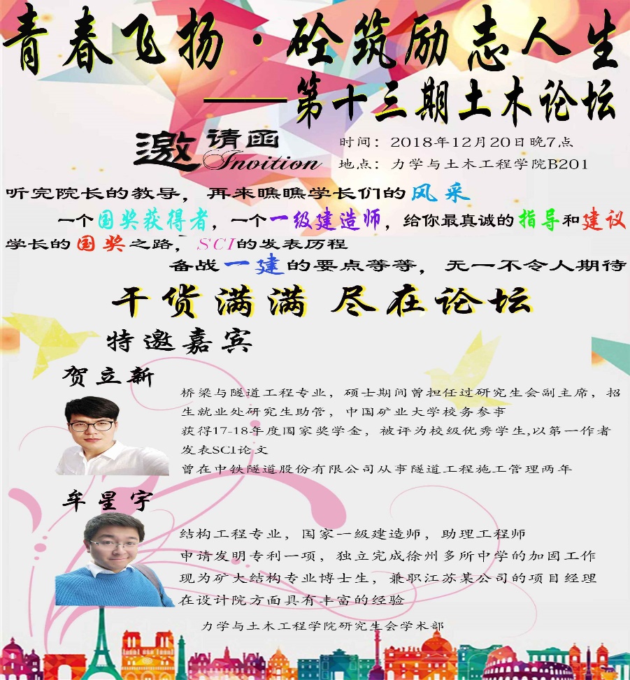 牟星宇,男,结构工程专业,导师吕恒林,国家一级建造师,助理工程师,申请发明专利一项,投稿江苏省加固会议论文并会议发言,独立完成徐州多所中学的加固设计,现为矿大结构工程博士生还是江苏某公司的项目经理(兼职),拥有多年的工作经历尤其在设计院方面有着丰富的经验。