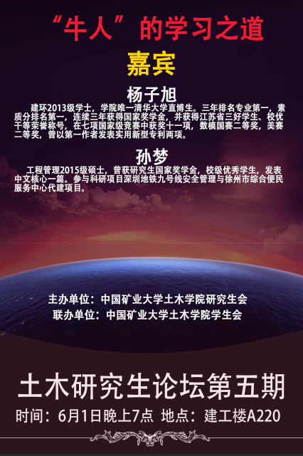 为此,我们邀请了本院唯一的清华直博生与一名工程管理国奖获得者为大家传授他们的学习之道,欢迎大家于2017年6月1日晚7点前往建工楼A220前来聆听他们的科研故事,相互交流经验,相互学习,相互提高!