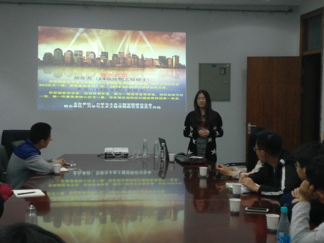 研究生党员工作站联办的“土木研究生论坛—探究新材料,研究结构热点”讲座在建工院A220举行,本次活动邀请到14级结构工程的国奖获得者胡亦杰与朱蕊围绕着“探究新材料—研究结构热点”这一主题帮助同学们了解结构工程的发展趋势与研究热点。