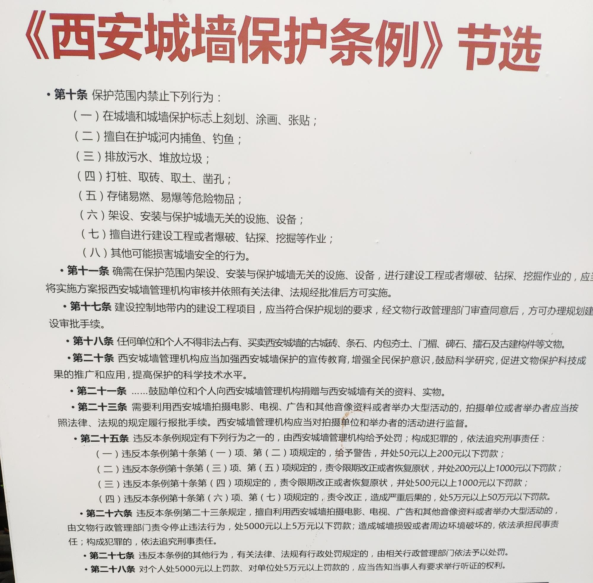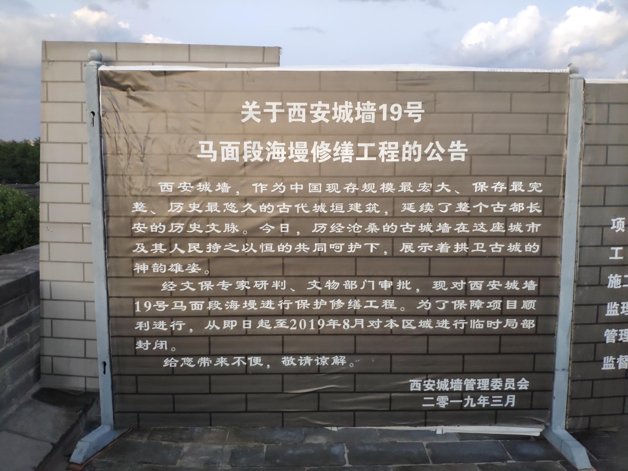 图6为从南门登上城墙后遇到的西安城墙管理委员会的保护维修公告。