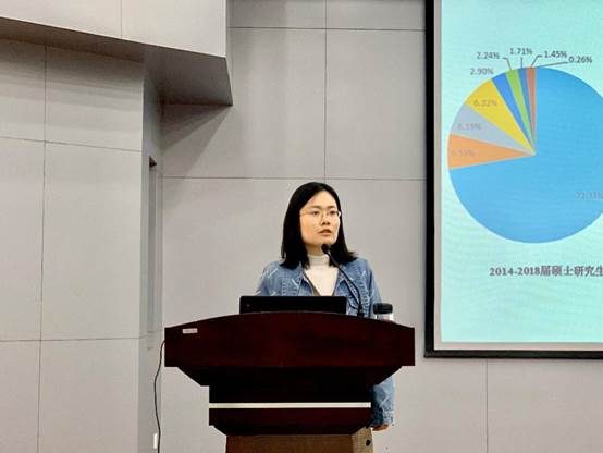 论坛中,骆老师围绕 “学院研究生就业情况”、“就业误区”、“用人单位最看重的品质”三个部分展开。首先,骆老师从近五年毕业生人数、就业率情况、就业单位性质及行业分布情况等方面进行介绍,重点对现在的就业形势进行详细的分析。针对于现在学生在求职过程中可能存在的问题,如“非地产行业不去”、“非家近企业不去”、“非高薪企业不去”、“非第一目标不去”等误区,骆老师结合自身多年学生工作的经验,一一解答。