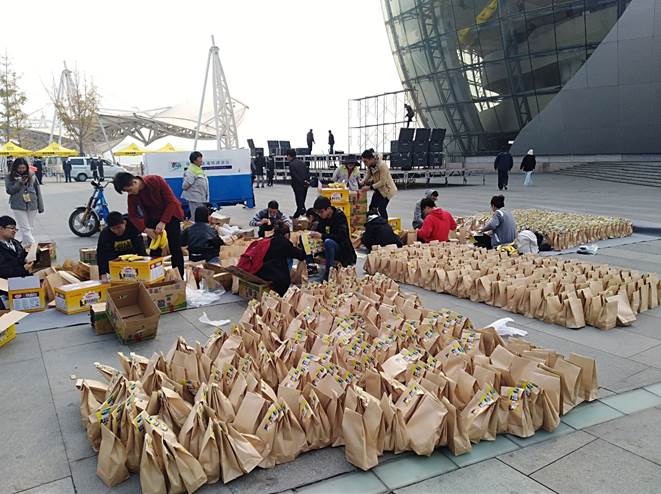 为保证志愿活动的顺利开展,志愿者早早在音乐厅门口集合完毕并认真听取了活动要求及注意事项,领取了由万科精心准备的活动T恤。随后志愿者们便开始分组搬运和分拣物资,活动过程中每位志愿者都秉持着严谨负责的态度,互相协助,流水作业,高效的完成工作。现场洋溢的热情与欢乐的气氛交相辉映,分拣工作井然有序。经过2个小时的紧张工作,3000份物资准备完毕。中午十二时许,志愿活动接近尾声,志愿者们耐心地清理地上的垃圾,收拾好剩余物资,站好志愿服务的最后一班岗。