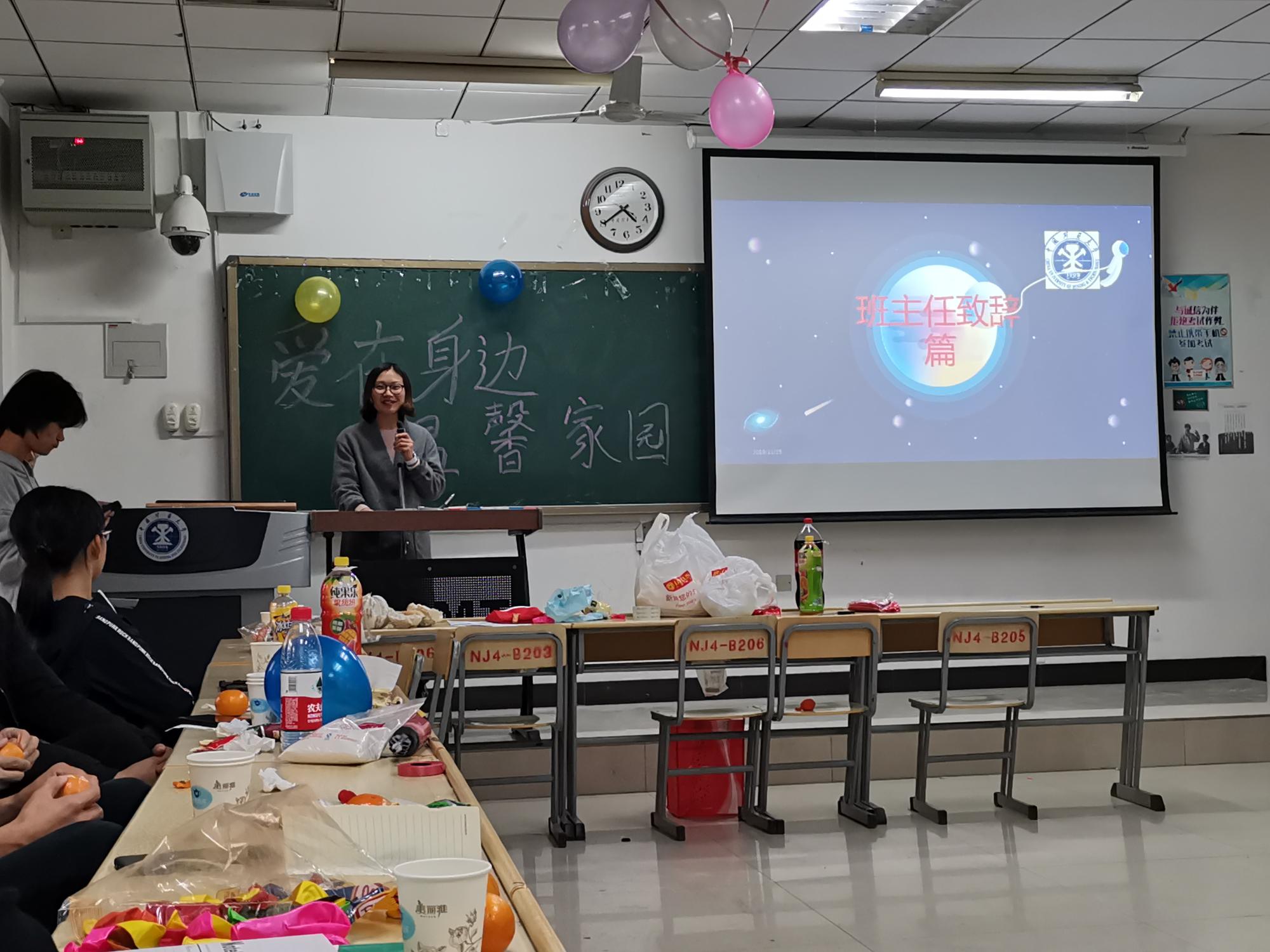本次班会由班级心理委员冼芳艳和萨琪尔同学共同主持。班会伊始冼芳艳同学介绍了本次班会的背景和目的,随后萨琪尔同学向老师和同学们介绍了本次班会的主要流程。班主任邢燕老师对同学们近期的表现做了总结,并祝愿他们能够度过一个充实的大学时光。