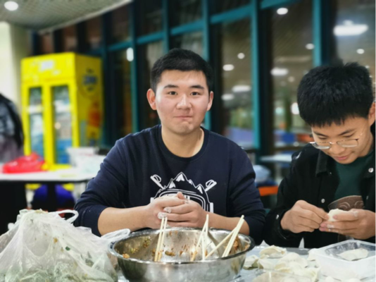 18时,同学们准时抵达二食堂,来自北方的同学大显身手,和面、擀皮、包饺子,各种技巧信手拈来。南方的同学也不甘示弱,逐渐掌握包饺子技巧,充满了欢声笑语。同学们分工明确,饺子皮在同学们手中逐渐成型。在包饺子的过程中,每个地方的同学都有不同的想法和包法,各式各样精致的饺子呈现在大家眼前。在全班同学的共同努力下,大家顺利地吃上了充满情谊的热乎乎的饺子。
