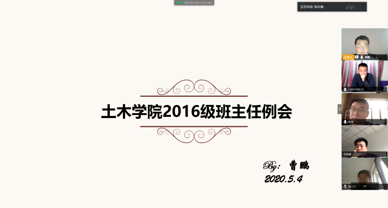 随后,张庆春副书记对疫情防控期间班主任的辛苦工作表示感谢,介绍了学院学生返校情况,传达了学校学院关于校园疫情防控和学生教育管理的相关要求,并对现阶段班主任工作提出了要求。一是要结合学校学院近期重点工作,加强返校学生的管理,尤其是请销假和晚点名的管理。二是要主动走进学生,通过召开班会、走访宿舍和一对一交流等方式,落实学校大走访,大调查工作,深入到学生群体之中,及时发现问题并解决问题,帮助学生顺利度过返校过渡期。三是要加强对毕业班考研学生的复试指导,加强对未就业学生的生涯指导,加强与计划考研二战学生的沟通和交流,帮助他们顺利升学就业,取得理想规划。四是要关注重点学生,充分发挥班级骨干作用,及时了解学生动态,确保班级学生安全。五是要加强学生离校前的安全稳定工作,切实关爱学生,让学生毕业后成为优秀校友,杰出校友,成为学院的宝贵资源和财富。