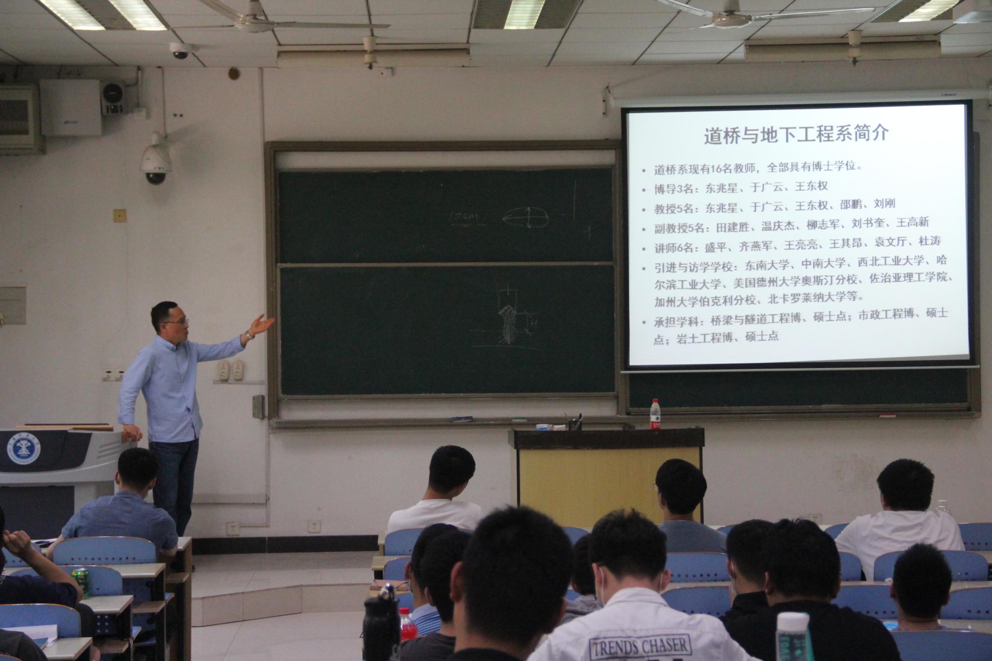 东兆星教授首先从发展历史、师资队伍建设、主要科研成果等方面,向同学们介绍了学院道桥与地下工程系的总体情况。接着,他结合国内外最新研究情况,向同学们详细讲述了系所四个科研团队的研究方向、团队成员、科研进展和成果等。最后,东教授一一解答了同学们的提问,并结合自身科研、教学经验,对同学们现阶段可能遇到的问题做了详细的分析,为同学们提供了宝贵的建议。他还鼓励同学们要勇于攀登科研高峰,希望大家在生涯规划阶段能够选择留校,实现自身发展的同时,为学校、学院发展做出贡献。