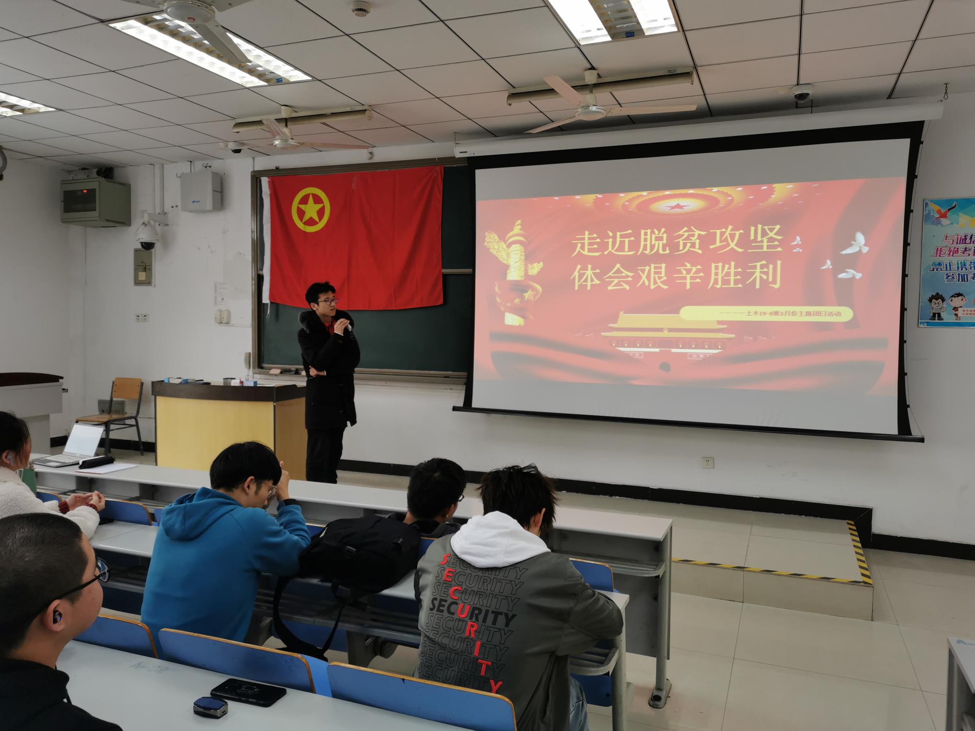 3月20日下午土木工程19级8班于博一B203开展了以“走近脱贫攻坚,体会艰辛胜利”为主题的团日活动,团支书谭力文主持了此次活动,8班全体同学参与其中。