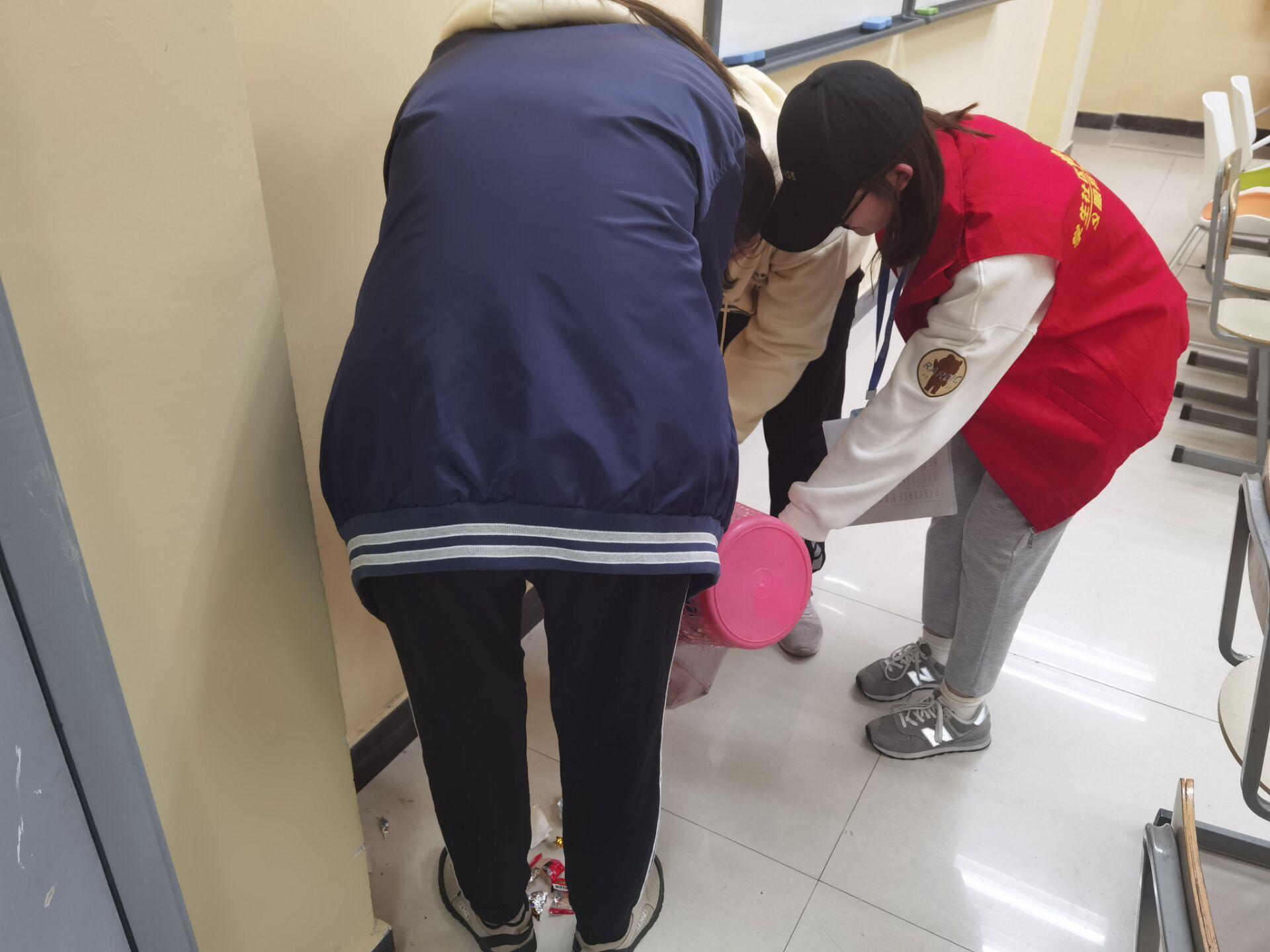 活动开始前,工作人员对所有志愿者进行了简单的培训,并强调本次活动的要求。为减小对自习同学的影响,工作人员对志愿者们进行分区分组,尽可能地减小打扫的动静,并且禁止他们在打扫期间高声喧哗。为方便志愿者们进行打扫,本次活动由工作人员提供抹布等工具。每个志愿小组对桌面,桌柜,黑板,讲台桌,地面,抽屉等的清理进行了分工。活动结束后,志愿者将现场垃圾清理带走,并由负责考核的工作人员对教室清洁度进行考核,以确定志愿者们是否完成清扫。