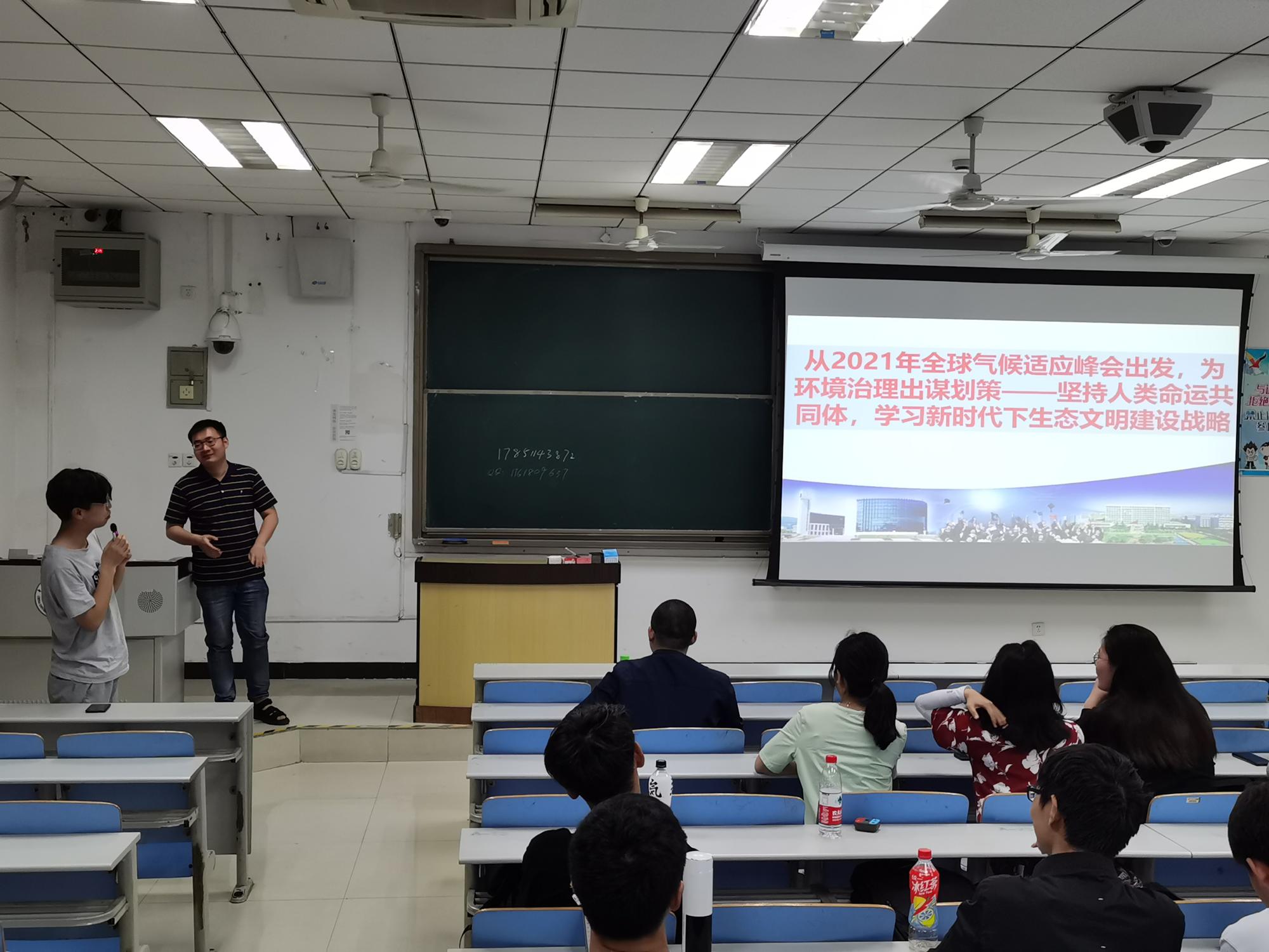 第二个环节中,班主任刘元亮老师从2021年全球气候适应峰会出发,向同学们介绍了世界环境现状以及我国环境情况,并对当下的环境治理政策进行了充分地阐释。最后,他号召同学们立足自己所学专业,学习新时代下生态文明建设战略,为生态文明建设贡献自己的一份力量。