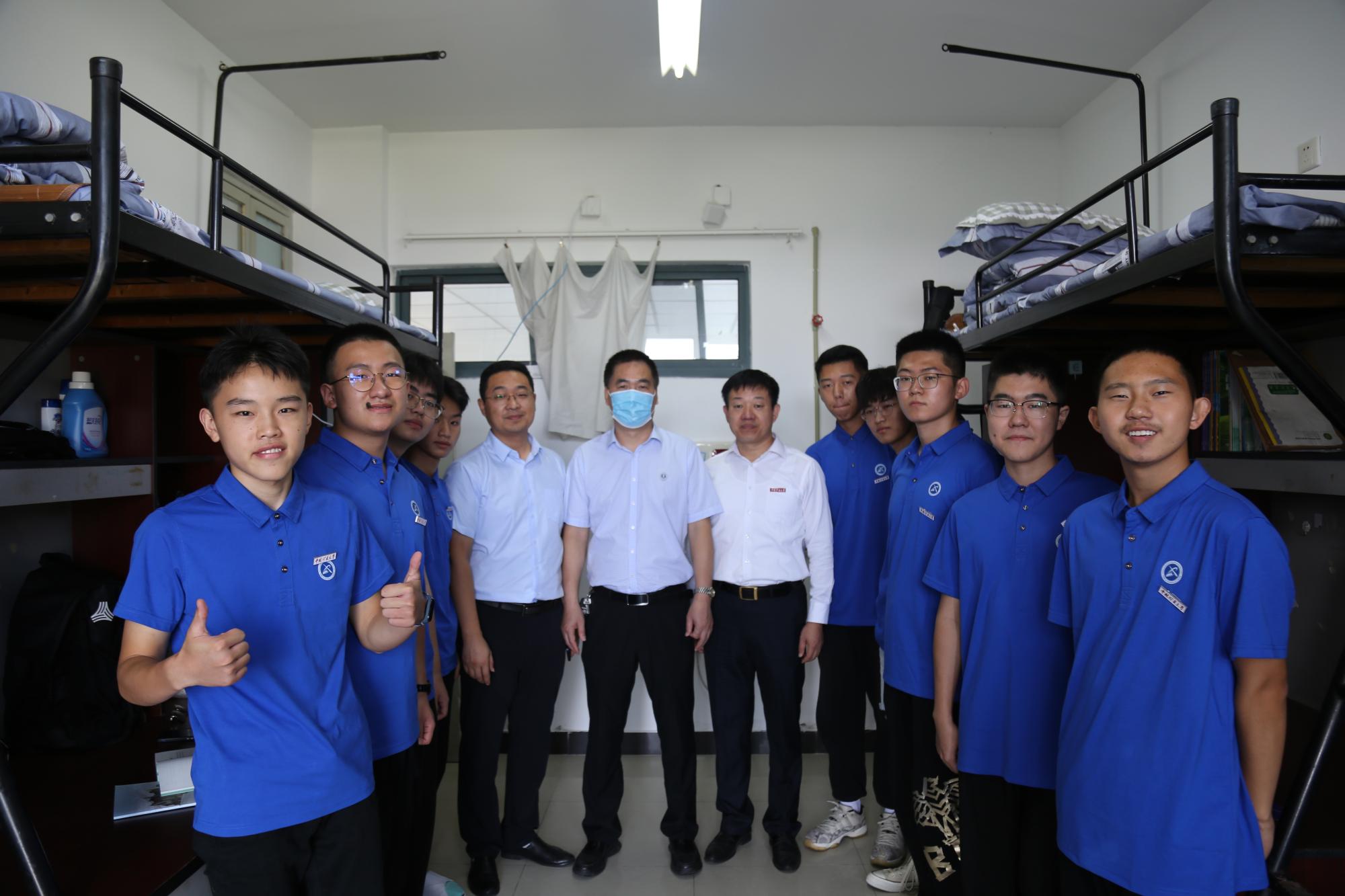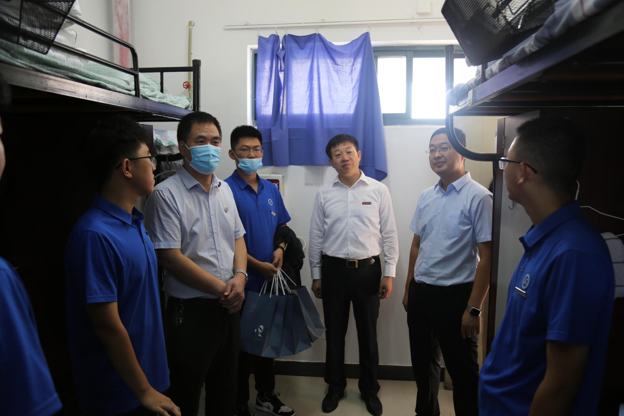 党委书记高顶、院长马占国、党委副书记李智、团委书记李亮、辅导员张琳走进学生宿舍楼,为刚入校的21级新生送去节日的温暖。