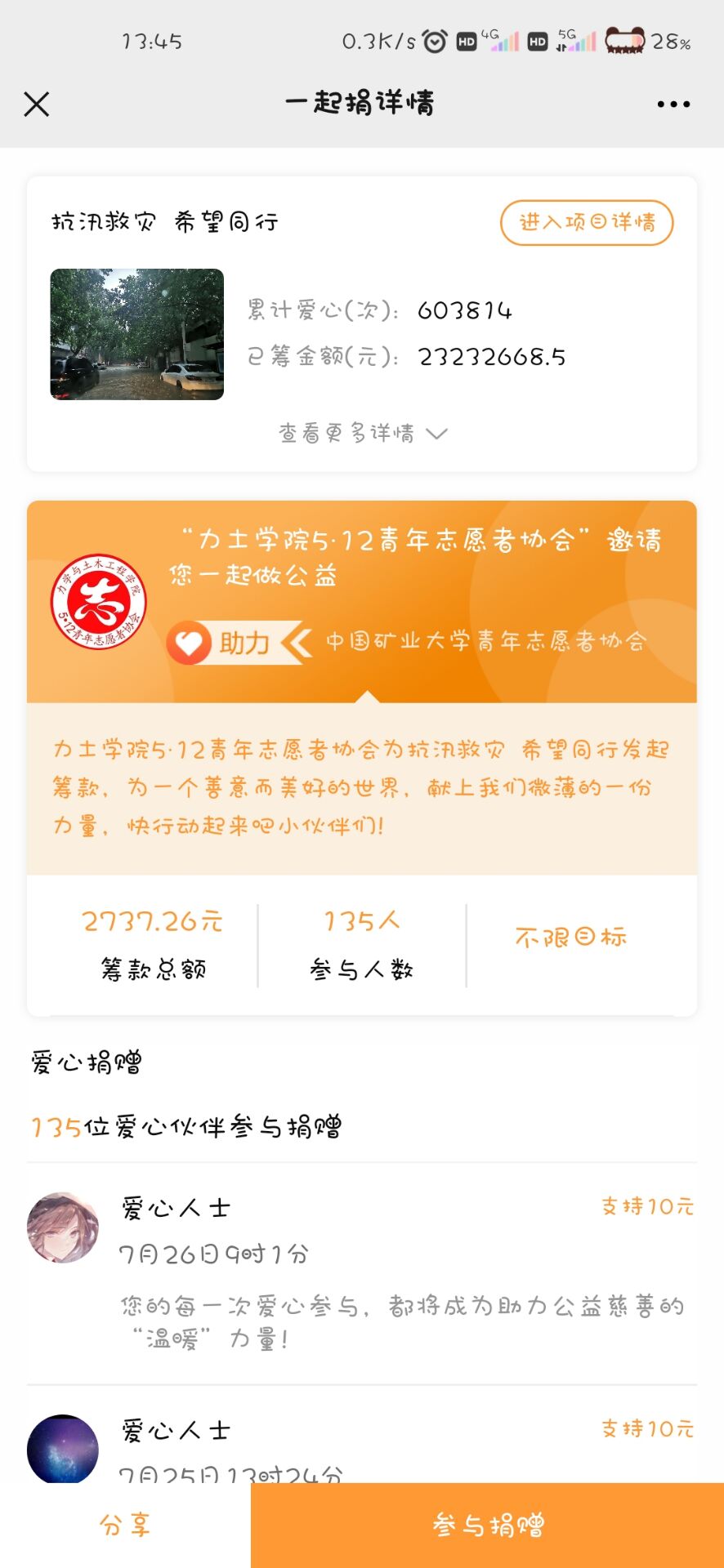 七月中旬,一场暴雨突袭河南,通行被阻,群众被困,这突如其来的暴雨让人们措手不及。但是消防队员紧急出动,人民子弟兵驰援河南,解救大量群众于危难之际。一方有难,八方支援,社会各界纷纷向河南伸出援手,组织捐款活动。力土学院青协也通过社交软件向同学们告知河南水灾情况,为河南募集捐款。在全国各界的持续关注与帮助下,河南成功渡过此次难关。
