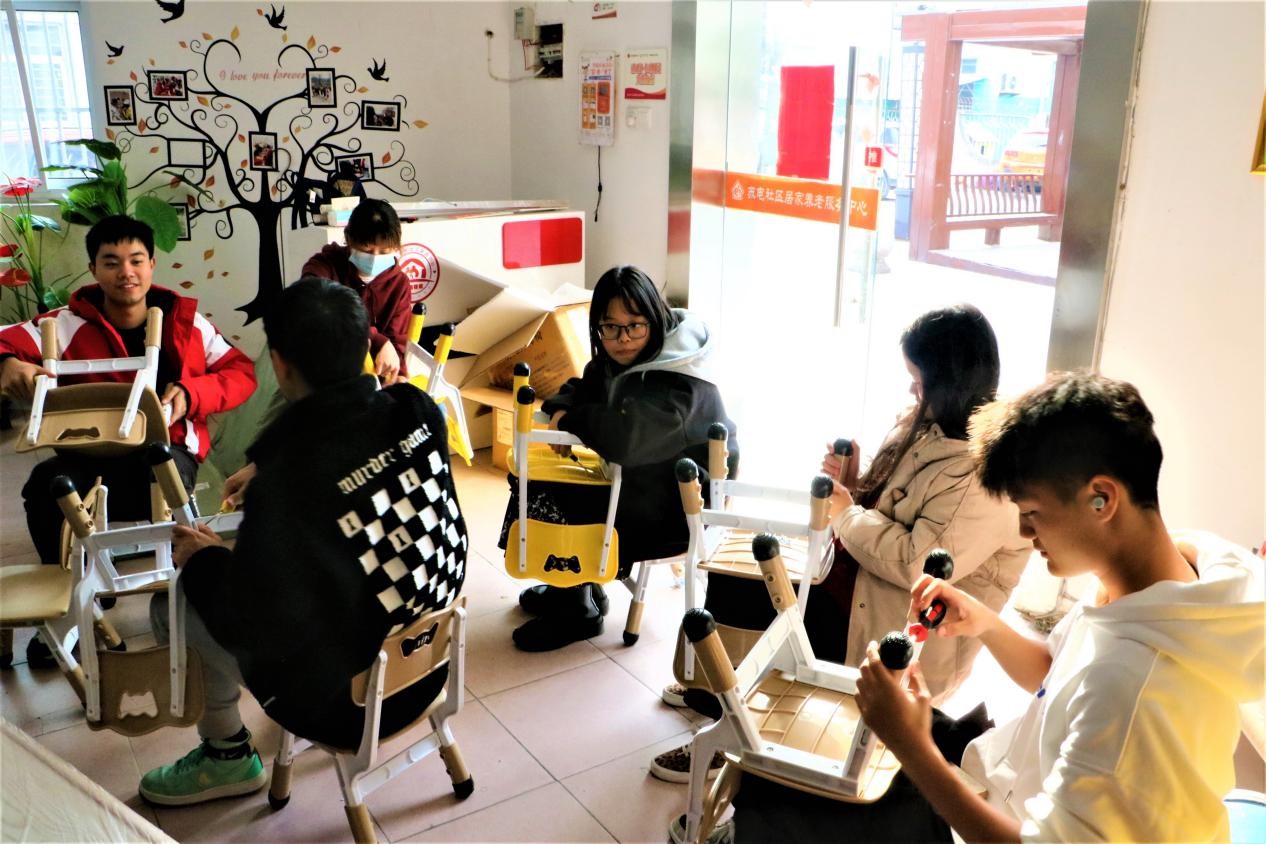 在本次公益活动两位负责人何文博同学与吴梦嫣然同学的带领下,筑梦爱心公益组织的相关成员分两批在学校东门集合,分别乘车前往祥和小区。到达目的地后,志愿者们立刻开始了工作。一部分同学负责服务场地中桌椅等日常用品的组装,另一部分同学负责对室内环境进行设计、装饰,在大家的配合下,工作有条不紊地开展。