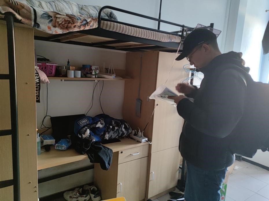此次检查范围为文昌校区研究生宿舍,即对学7、学34宿舍楼的卫生情况及用电安全问题进行检查。此次检查结果整体情况良好,宿舍环境有所改观,未发现违章电器等不安全因素。但仍有部分寝室未按要求张贴床卡、宿舍桌面杂乱,检查人员对存在以上问题的宿舍提出了整改措施并定期复查,希望同学们积极配合检查人员,同时养成良好的卫生习惯。