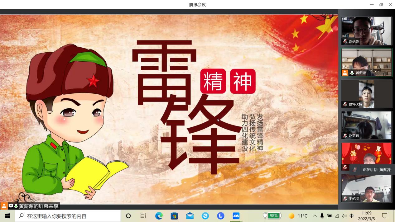活动伊始,黄薪源同学通过一则视频揭露了当今社会部分人雷锋精神的缺失和一些人对雷锋精神的质疑,引发了同学们的思考,由此引入了本次团日活动的主题——学习雷锋好榜样、传递青春正能量。接着,黄薪源同学通过讲解PPT带领大家了解了雷锋同志的生平,学习了什么是雷锋精神、为什么要学习雷锋以及怎样学习雷锋,在这一过程中也对视频里反映的现象进行了批驳。之后,黄薪源同学再次播放了一则视频,让同学们进一步感受到了雷锋精神的深刻内涵。活动最后进行寒假社会实践成果展示,黄薪源向同学们分享了邳州市第一次自然灾害综合风险普查报告,杨治熙同学为大家分享了寒假在母校的宣讲活动,二人分别交流了各自的心得体会,使同学们更加深刻地了解到了奉献的意义。