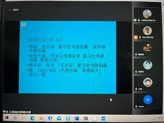 分享会上,王璐瑶和吴梦科同学依次为大家分享了考研相关信息,向大家介绍了考研需要做的准备,同时根据考研备考时间节点,分享了如何进行时间规划,并就高数、英语等公共课进行参考习题推荐、学习方法分享。针对同学们的疑问,诸如如何调整备考心态、怎样选择备考学校等,两位同学从自身经验出发,一一为同学们答疑解惑。