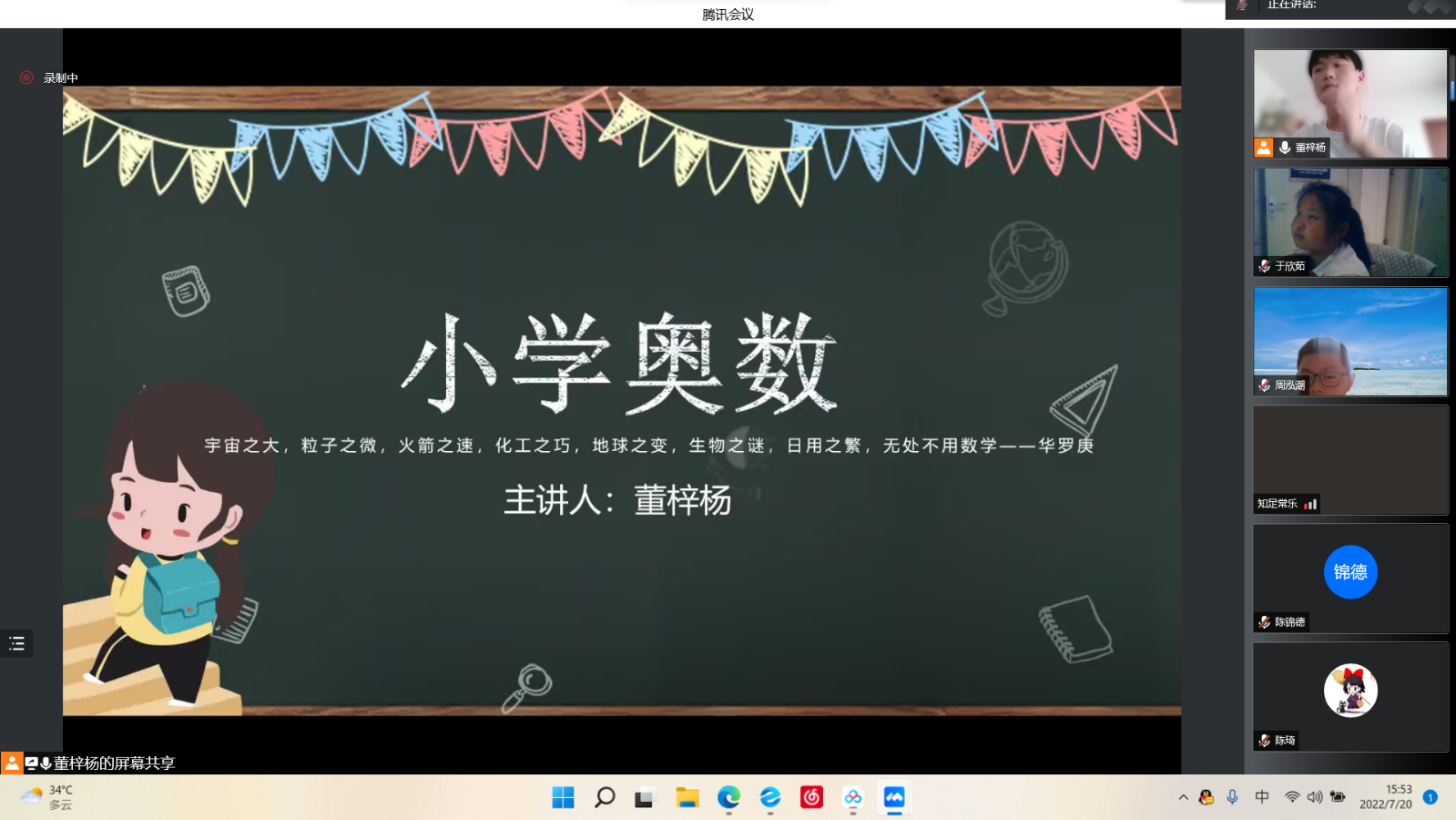 上午,李晓峰同学通过知识与故事相融合的方式为同学们带来了一堂生动有趣的法治课堂。李晓峰同学首先通过几个案例引发了孩子们对相关法治知识的思考,并以此切入主题,引出课堂内容:要强化法律意识,提升法治思维,一方面规范好自身行为;另一方面在遇到不法侵害时要勇于发声,拿起法律的武器保护自己,维护自身权益。课上,同学们参与度高,氛围积极活跃。下午的课程则是由董梓杨同学作为主讲老师给同学们上的一堂精彩纷呈的奥数课程。课程伊始,董梓杨同学通过一个与数学有关的趣味故事开启本次授课,有效地带动了课堂氛围和同学们的上课热情。随后,董梓杨同学通过知识点与例题相结合的方式,帮助同学们更好地理解和领会课程内容。在交流互动的过程中,同学们积极回应,踊跃表达自己的想法,并由董梓杨同学帮助解答。