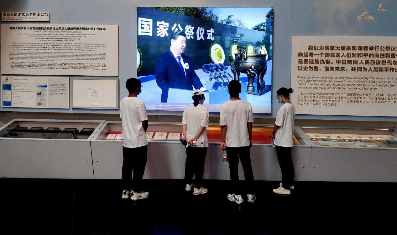 图为“红途话构”实践团在南京大屠杀史实馆中观看习近平总书记在国家公祭日的讲话