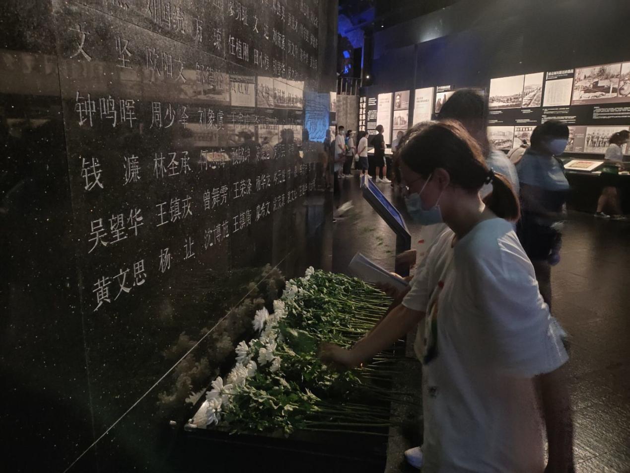 7月29日,实践团成员来到南京大屠杀史实展和侵华日军南京大屠杀遇难同胞纪念馆的利济巷馆区。通过窄窄的入口,有三位衣衫褴褛的女性雕像,其背后是一滴硕大的“泪珠”,饱含着对侵略者的控诉与对生的渴望。右侧是与屋顶齐高的幸存者照片墙,每一张照片都代表着一个鲜活生命的破碎。实践团成员纷纷捐了款,手捧白菊向她们默哀。从A馆进入,场馆布局极为简洁,窄小的走廊两边是对称的房间。室外日光灿烂,生机盎然,与屋内大字报上满目疮痍的世界截然不同。从天花板垂吊而下渐次形成的同心圆围绕着一滴硕大的泪珠,展厅墙上的半截女性雕像在哭泣,泪水滴落溅起回响,在实践团成员的内心引起震荡。离开展区后,实践团成员的心情仍久久不能平静。