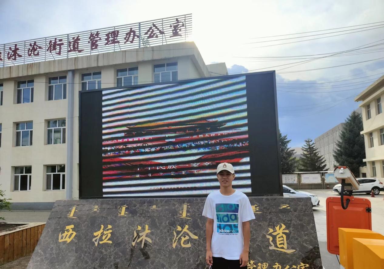 图为实践团成员在经棚镇西拉沐沦红色文化社区门口