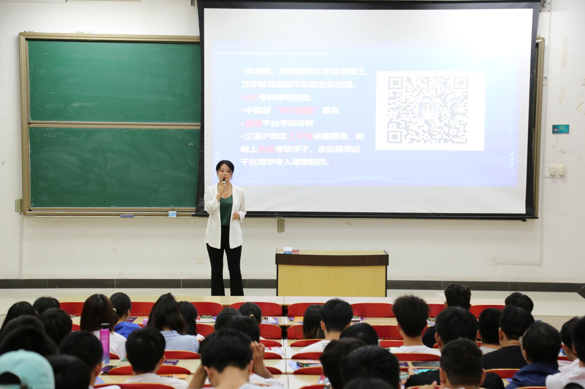 讲座现场,李老师首先为大家分析了当今考研、就业形势。她表示,目前考研考公人数逐年上升,竞争压力也不断增大,某些岗位可能存在众多竞争对手,大家迫切需要提升自身竞争力,做好职业生涯规划。接着,李老师全面、详细地为同学们讲解了考研过程中每一个阶段需要注意和考虑的事项,为即将准备考研的学子们进行了全方位的指导。之后,李老师从研究生报考的类型、专业、学校等几个方面为同学们解答了如何正确填报志愿这一问题。她希望大家在填报院校之前先收集好相关资料,仔细研读各学校最新招生政策,形成较为充分的认识,结合实际情况严谨、慎重地填报。最后,对于同学们提出的疑惑,李老师一一做了细致耐心的解答,并勉励大家保持热情、积极备考,“长风破浪会有时,直挂云帆济沧海”。讲座结束后,来自万学教育集团的老师向同学们分发了赠书券。
