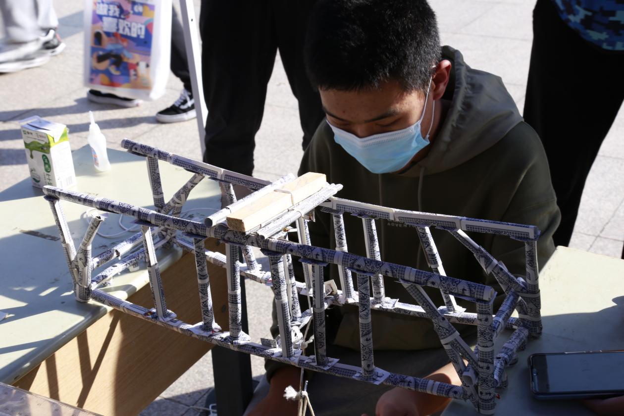 本次大赛需要各参赛选手自行组队并在报名结束后相应时间段内完成材料领取与模型制作。上午8点,比赛准时开始。各组参赛选手在工作人员的协助下先对模型进行称重和编号,再进行现场加载。加载过程中,每只队伍有三次加砝码的机会,由每组队员自行决定是否继续加砝码以及加砝码的质量,这充分考验了参赛选手对模型的认知把握。活动现场,各位参赛选手全神贯注地进行加载,观众也屏息凝神关注着,在加载成功后现场响起阵阵喝彩声。