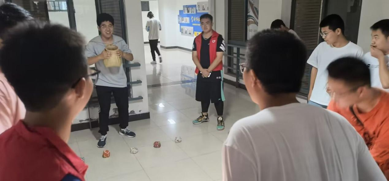 学生陆续来到活动现场并依据参赛规则完成各个游戏。第一个游戏为“猜灯谜”,参赛者随机抽取桌面上的一张字条,在30秒内解出字条上的谜面即可获得奖品。第二个游戏为“投绣球”,参赛者需要在一分半时间内尽可能多地将沙包投进队友胸前的竹篓里,投够规定数量即可领取对应奖品。最后一个游戏是“乾坤圈”,在参赛者面前布置了一些奖励,参赛者每次可以领取5个套环,套中即可带走。同学们积极参与各个活动,现场洋溢着一片欢声笑语,和谐、热闹的节日氛围格外浓厚。
