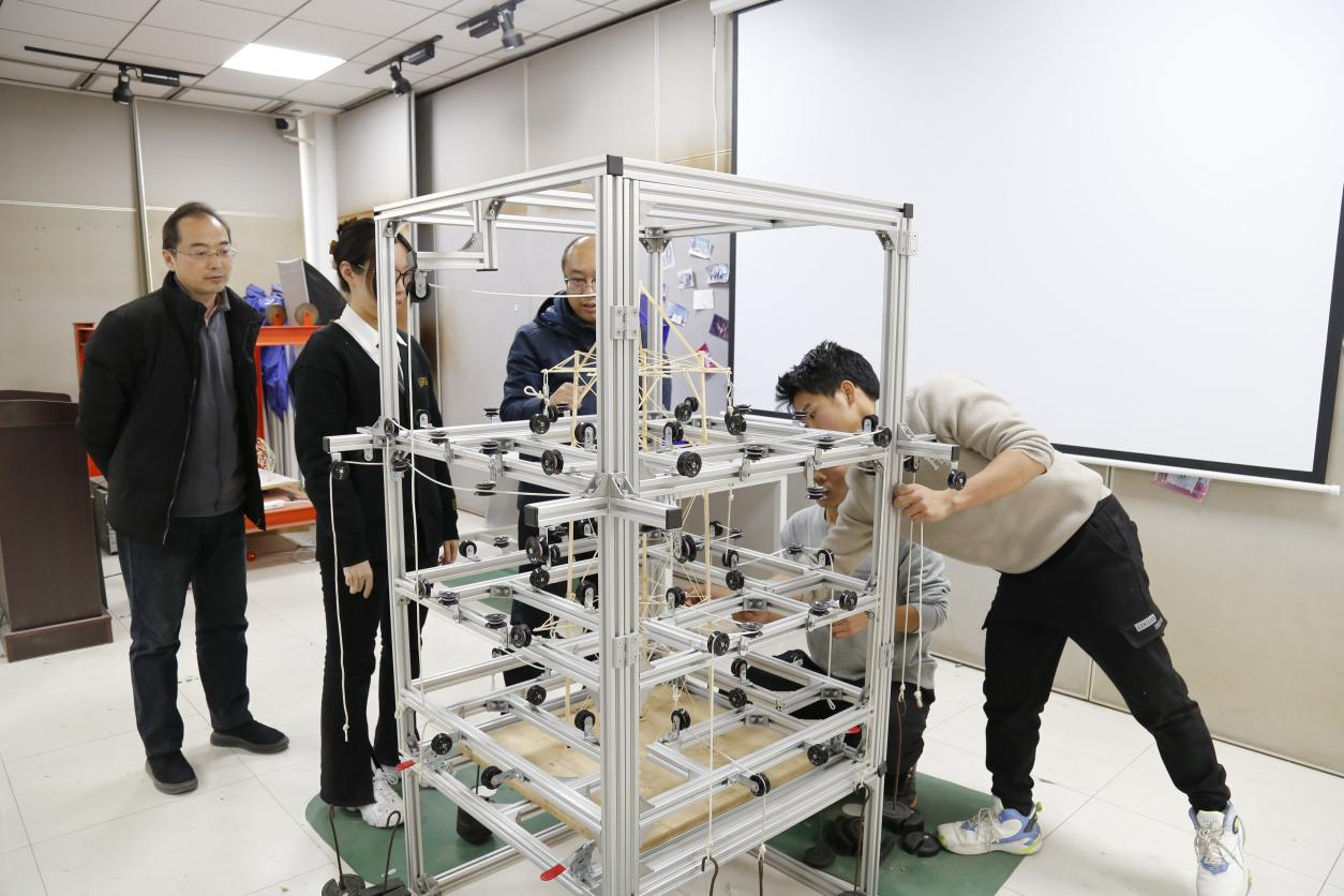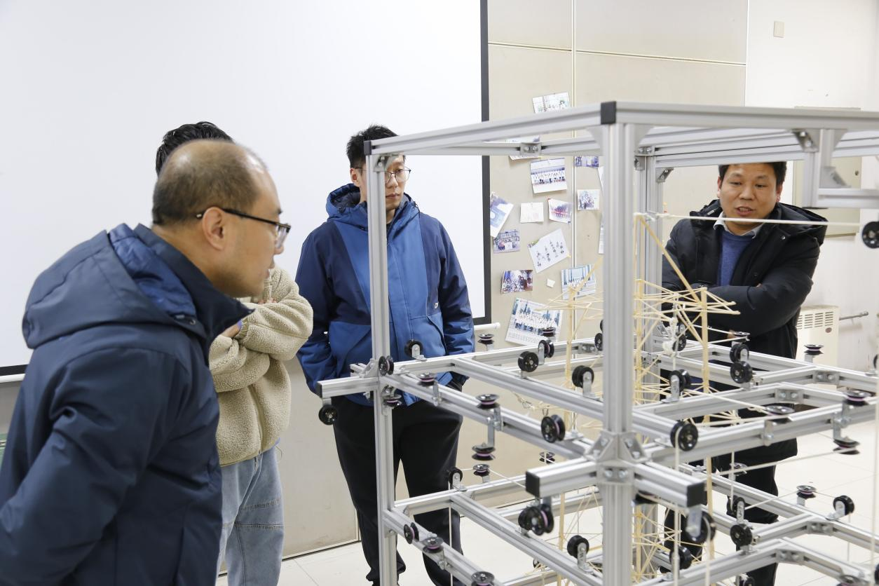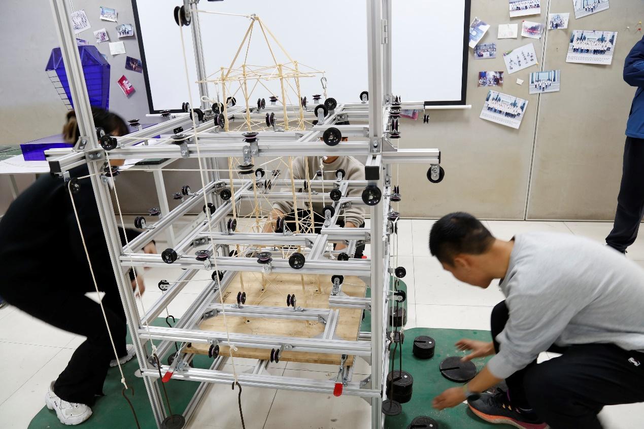 活动现场,老师们先观看了参赛模型,与队员们讨论了赛题关于模型尺寸、结构、载荷的相关要求,并了解了模型的制作过程。之后,在老师的指导下,队员们一同对模型进行了多次加载,进一步了解了模型在不同承载条件下的弯曲变形情况及结构稳定性。最后,大家结合加载结果对模型进行了分析,并探讨了改进方法。饶奥同学结合自身参赛经历,在模型构件的选材、制作和优化等方面提供了一些建议。