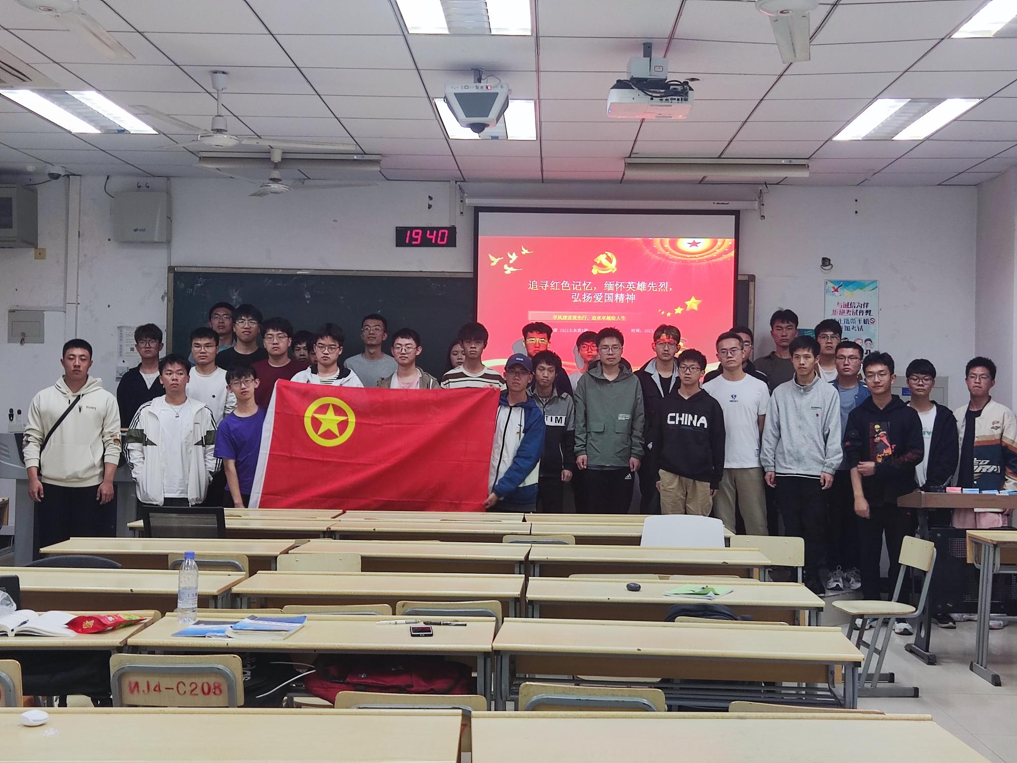 土木22级8班、9班于博四C208开展了以“追寻红色记忆,缅怀英雄先烈,弘扬爱国精神”为主题的班会活动。此次活动由9班团支书姜洪杰主持,8班、9班同学积极参与。