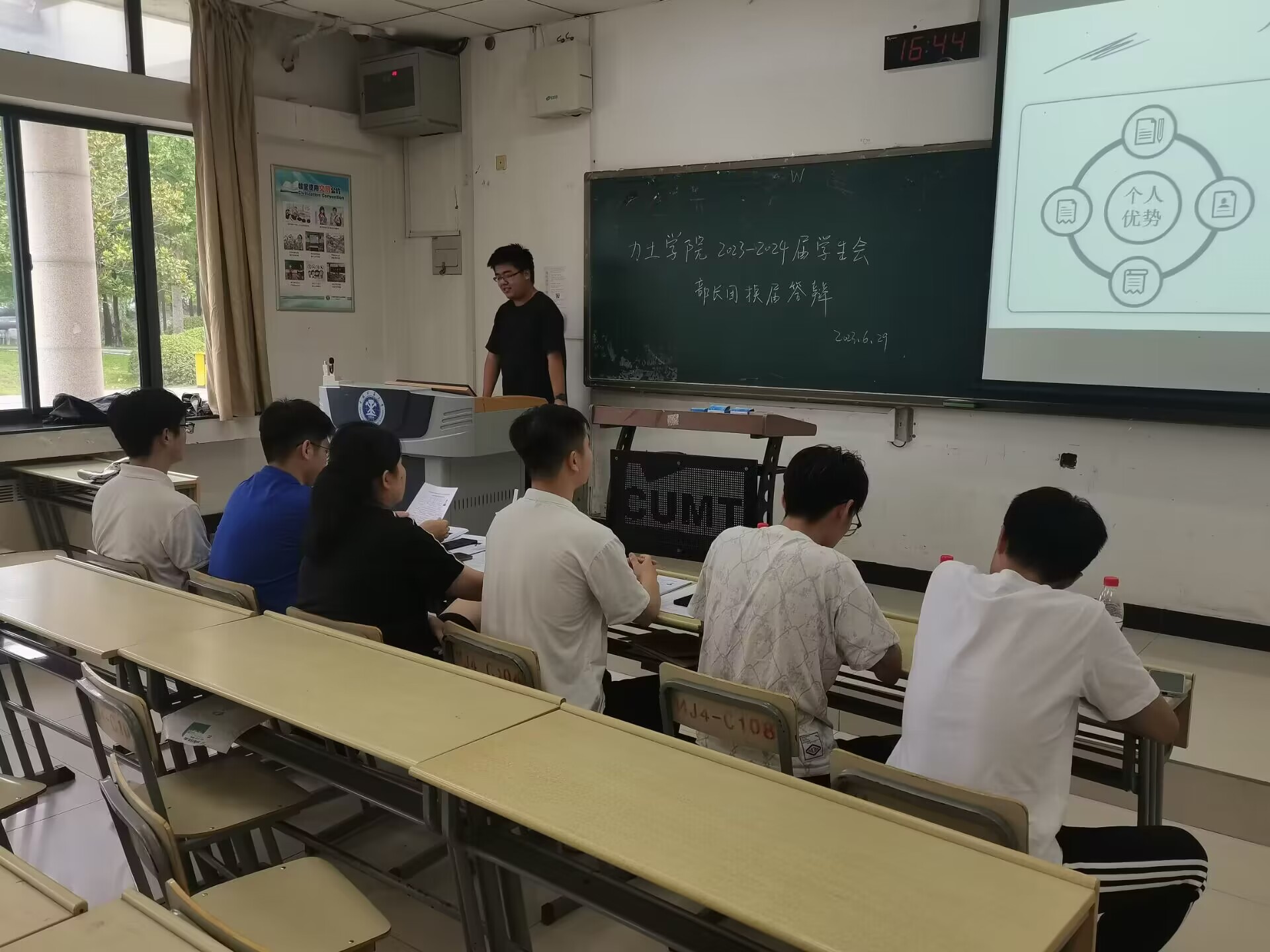 学生会于博四C104开展学院学生会部长团换届工作。本次答辩由学生会指导老师朱宁与学生会主席团成员担任评委。
