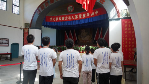 7月24日下午,实践团抵达杨家岭革命旧址。在中央大礼堂旧址前,实践团聆听席军良副教授讲授主题为“弘扬七大精神,增强看齐意识”专题党课。实践团学习到,在党的历史上具有里程碑意义的党的第七次全国代表大会在中央大礼堂召开。席军良强调大学生要牢记“看齐意识”,明确新时代大学生党员应当怎么做的问题。随后,实践团跟随讲解员参观了中央大礼堂旧址和中共中央办公厅旧址,毛泽东、朱德、周恩来等人的旧居,每一件文物都带着历史留下的痕迹,置身其中,实践团仿佛看到老一辈革命家日夜辛勤工作的身影,从中感悟到革命历程的艰辛。实践团走过毛泽东种过的菜地,仿佛回到那段峥嵘岁月,切身感受到了“自己动手,丰衣足食”的伟大精神。
