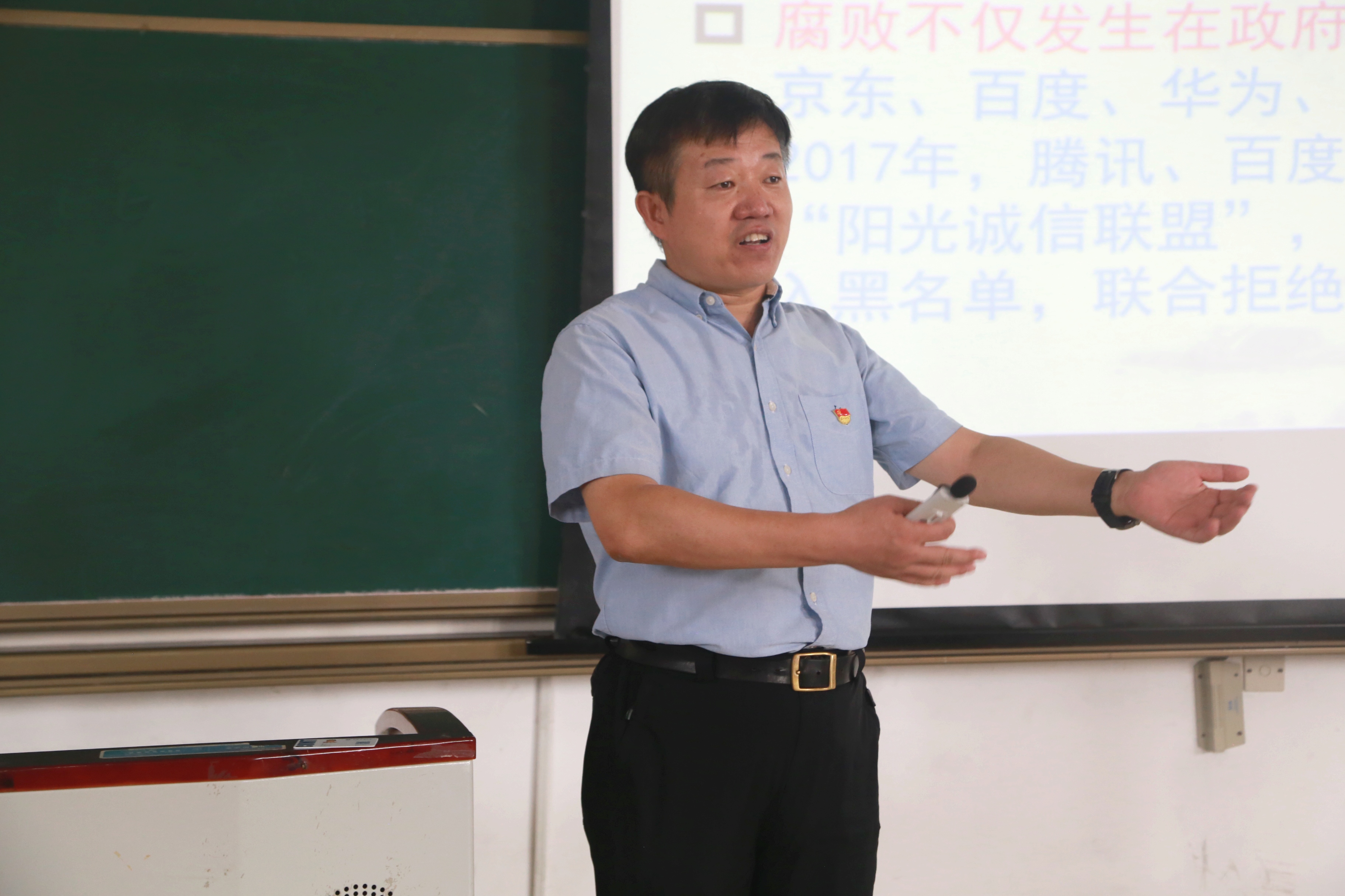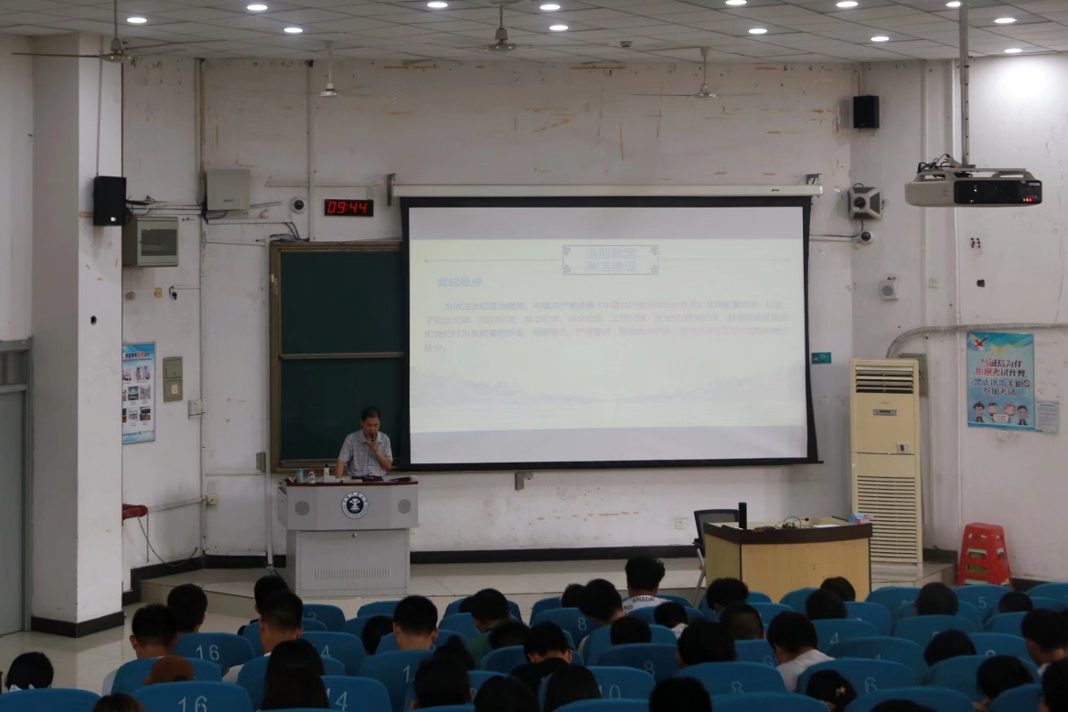 大学生廉洁守纪教育讲座上,路铭向大家简短介绍了这次讲座的主题。而后马占国和潘盘甫从廉洁的概念开始阐述,将抽象的廉洁概念具象化。并指出廉洁不可或缺的重要作用,由于腐败现象是普遍存在的,腐败不仅发生在政府公权力范围内,各种社会组织也可能发生腐败。社会拥有廉洁的风气,腐败的滋生便会减少。随后就当前我国廉洁建设展开叙述,从党和国家层面到企业层面、学校层面廉洁建设全面铺开。在党的廉政建设层面,分析了党纪处分警告、严重警告、撤销党内职务、党内观察、开除党籍的含义及意义。在学校层面,着重强调了学生个人如何廉洁守纪,对于普通学生来说,考试作弊行为不可取,杜绝学术不端行为不可有,告诫同学们不要因小失大。对于学生干部来说,要提高道德修养积极奉献,树立公仆意识,积极为同学服务。