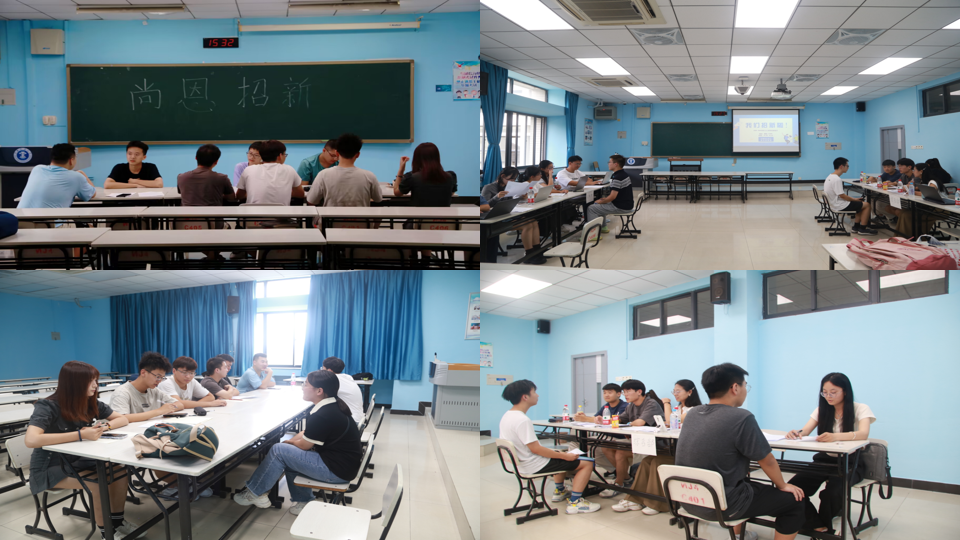 青协、团委、大传、心助、尚恩等各学生组织在博四教学楼展开招新面试工作。