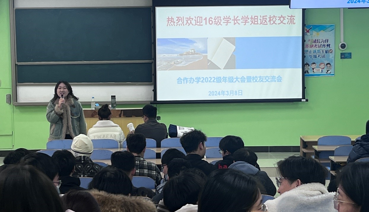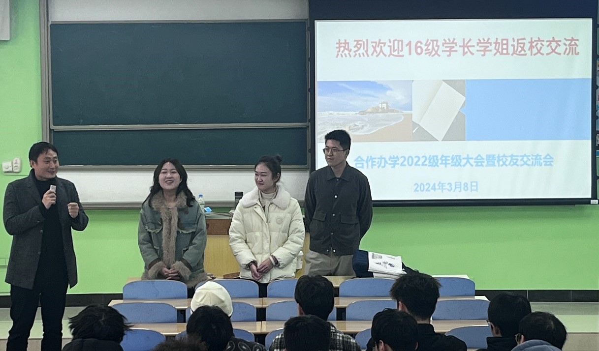 中外合作办学2022级专业全体学生于3月8日下午在博4A202举行年级大会暨校友返校交流会。2016级优秀校友王海铮、韩若愚、徐若恩应邀为2022级学子讲述自己的职业轨迹,并解答同学们对于选择发展道路的疑惑。本次活动由辅导员陈忠伟老师主持。