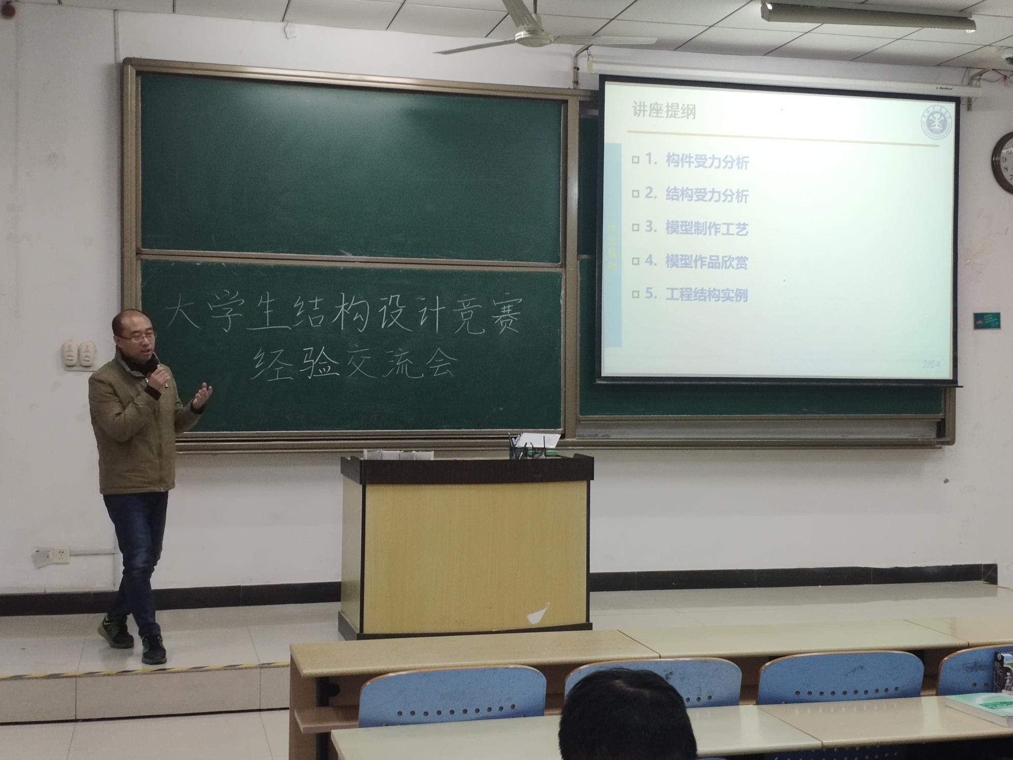为鼓励同学们积极参加结构类竞赛,培养同学们的创新意识,12月14日,学院创新协会于博一A103组织开展大学生结构竞赛交流会,学院结构竞赛指导老师范力副教授出席并为同学们讲解竞赛要点。
