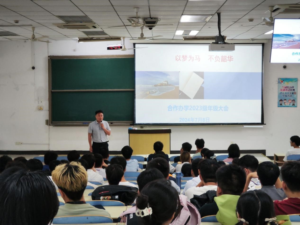 中外合作办学2023级于博1C103举行2023级中外合作办学年级大会,辅导员陈忠伟、郝辰翎及2023级中外合作办学全体学生参会。