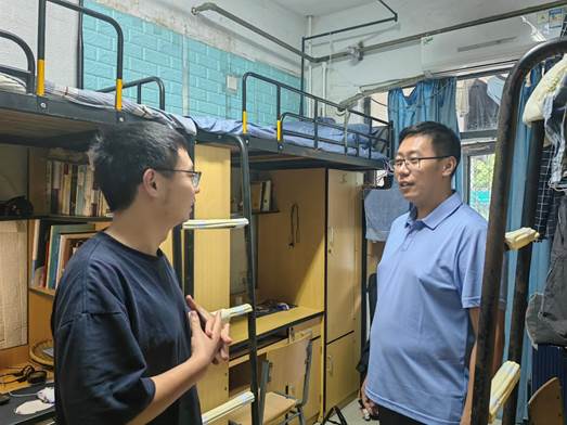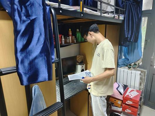 全部研究生宿舍,对学2、学4、学5、学7、学8及兰3等多个宿舍楼的卫生情况及用电安全问题进行检查,此次检查结果整体良好,未发现违章电器等不安全因素,但仍有部分宿舍存在杂、脏、乱等问题。此外,此次检查中发现少部分宿舍阳台堆放废弃纸箱,存在安全隐患,检查人员对存在以上问题的宿舍提出了整改要求。辅导员李亮与宿舍同学进行了交流,并提醒相关同学养成良好的卫生习惯、提升宿舍安全意识。