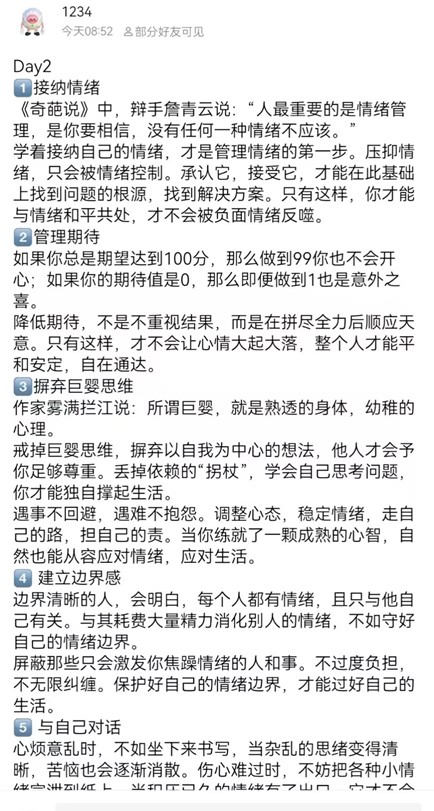 活动期间,参与者通过在社交媒体(如QQ空间、微信朋友圈等)进行打卡,以照片加介绍的方式分享各类心理知识,包括情绪管理、压力应对、自我认知、社交焦虑等多个方面。同学们积极查阅资料,精心制作打卡内容,不少人还分享了自己在实践中运用心理知识的心得体会。