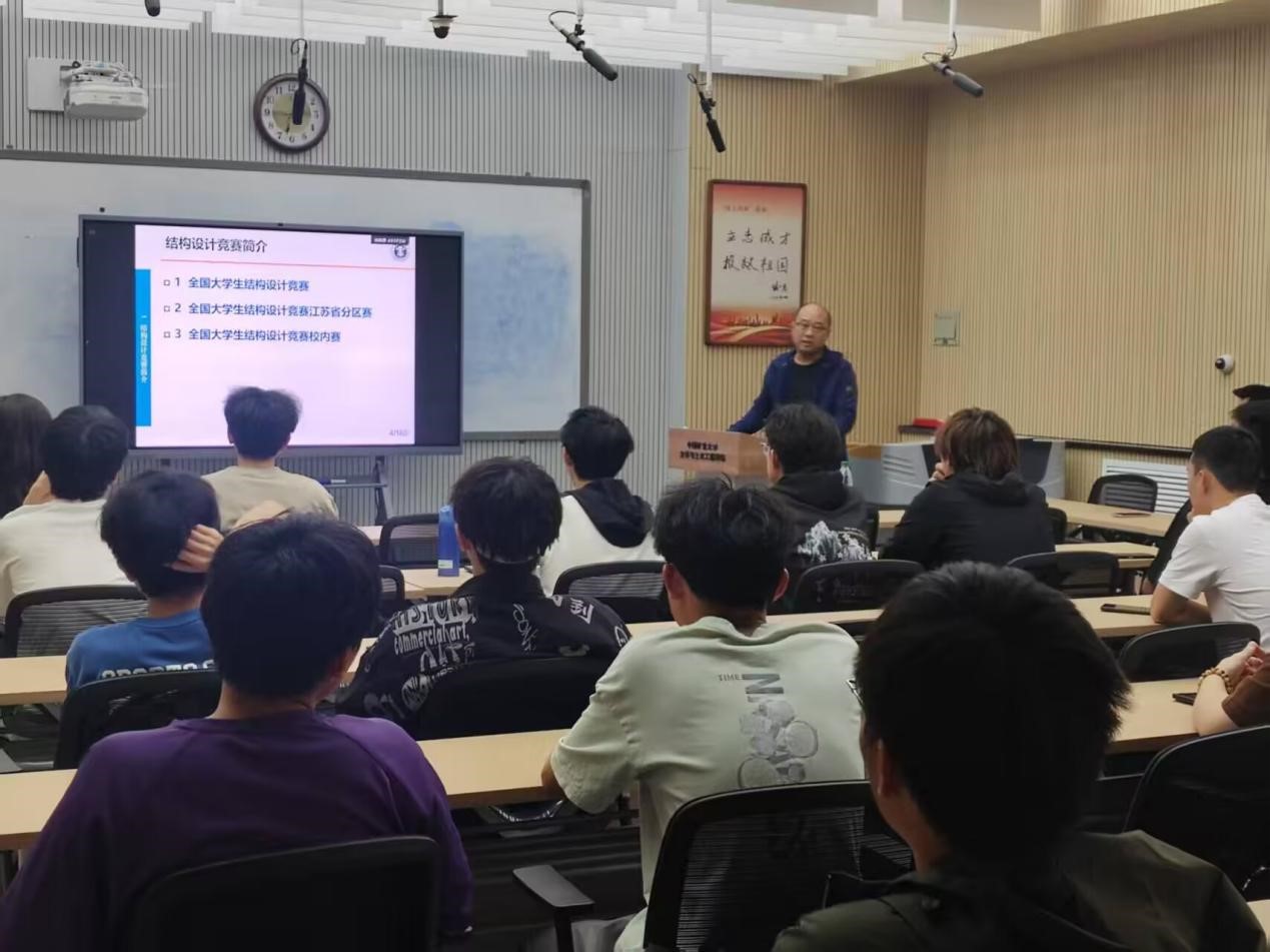 会议开始,由备赛组指导老师范力老师为大家进行结构设计竞赛的讲解。依次讲解全国大学生结构设计竞赛、江苏省分区赛以及校内赛的相关情况,让同学们清晰了解到不同级别赛事的规则、流程与特色,为大家参与竞赛指明方向。并通过展示国内知名建筑结构及往年的竞赛模型,从建筑的整体造型到内部力学结构,详细剖析其设计原理与精妙之处,让同学们直观感受到结构设计的魅力与应用,对全国大学生结构竞赛的模型做到心中有数,也为后续竞赛设计提供丰富的灵感源泉。