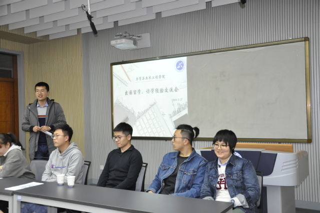 会议伊始,莫品强老师分享了自己的留学经验,结合曾在英国诺丁汉大学的求学经历和学生提出的问题向同学们详细讲解了选校定位、推荐信、语言考试、学校申请等一系列问题。莫老师在演讲中说到,出国留学有助于个人的全面发展,希望每个人都可以去开拓全新的视野,体验与在国内不一样的学习生活。随后,李玉琦、夏海天、马敏妤、叶政杰四位同学先后进行了经验分享。他们针对土木工程各个专业在国外的近况进行了详细地解读,综合世界权威数据,从他们各自不同的角度出发表达了许多实用性的看法,为同学们申请国外大学提供了参考。至此,交流会圆满结束。