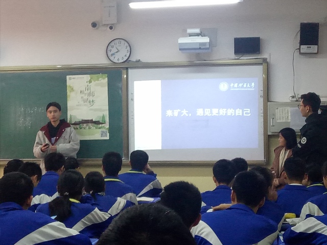 早上10点时,宣讲活动于学生教室内准时开始,队员王昊辰和俞靖为中学生们播放了矿大风景的延时摄影和宣讲PPT,引起学弟学妹们的兴趣,与此同时,队员们发放了宣传册,让学生们体会到矿大的风采,对矿大的学习环境有初步的了解。王昊辰依据幻灯片详细阐述了学校的基本情况,包括学术资源、人才培养模式、奖助体系等方面,充分展示矿大满足学生发展需求、提供充足发展平台等的优势,使得学弟学妹们对矿大的办学情况有了大致的认识。此外,他们还在幻灯片上展示矿大的衣食住行,包括美味的伙食和舒适的住宿条件,更激发了学生们在矿大学习的向往。俞靖还详细介绍她在高三期间的经历及学习经验,队员们一起给学弟学妹们加油打气,解决了在座学生提出的疑问,并对提出问题的学生奖励了矿大定制的精美签字笔。
