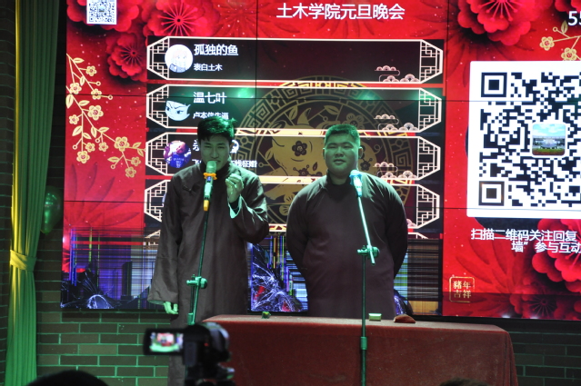 晚上7点30分,联欢会正式开始。晚会以各学生组织的新年祝福视频作为开场,点燃了在场同学们的激情,之后,主持人宣布晚会正式开始。院舞协的一段“Free Time”舞蹈,展示土木学子不仅在学业学风上有所建设,在舞蹈方面也有自己的独特的魅力,为台下的观众带来了一场视觉盛宴。生活部的小品《皇帝与刺客》自创笑点,诙谐幽默的情节、搞笑夸张的动作,为台下的观众带去了欢声笑语。当观众还沉浸在小品的回味中时,悠扬的曲调和充满磁性音色的歌曲吸引了大家,原来是心助的歌曲演唱《蓝莲花》。外联的同学们也不甘落后,一曲歌曲串烧讲现场的气氛引向高潮。最后,趁着活动进入高潮阶段,游洋老师和李栋老师上台为大家送去祝福,并进入最激动人心的环节——抽奖环节,由游洋老师和李栋老师抽取幸运“锦鲤”,并为其送上祝福和奖励。据了解,本次晚会由各部门和社团联合准备节目,有风趣幽默的小品,优雅动听的歌曲,赏心悦目的舞蹈,以多样化的形式展现了土木学子多才多艺的风采。