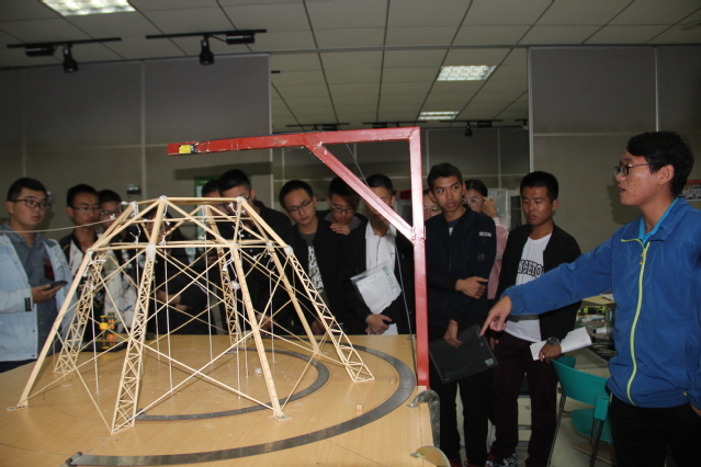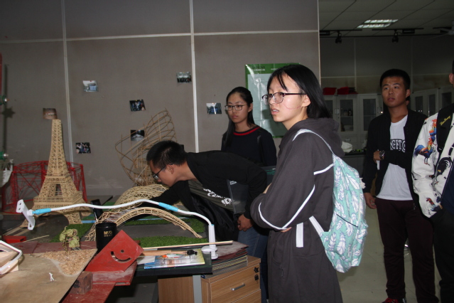 下午5时,同学们来到学院楼进行学习参观。首先展示的是大跨度网壳模型,该模型结构的所有杆件、节点、连接部件均采用比赛所给定竹材及胶水制作完成。制作该模型要求同学们针对静载、随机选位荷载及移动荷载等多种荷载工况下的空间结构进行受力分析、模型制作及试验。过程中创协的成员们还现场展示了该模型的受压能力并向感兴趣的同学传授了模型制作的经验和心得。