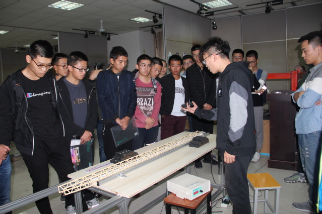 第二个展示的顶推桥梁结构模型的所有结构也均采用比赛给定的竹材及胶水制作完成。活动还现场模拟了使该模型在承受竖向均布静载的条件下进行顶推施工的情景。该实验旨在激发同学们对模型制作的创新意识。在老师和学长学姐的带领下,同学们还参观了创协历年参加江苏省结构设计竞赛的获奖作品。