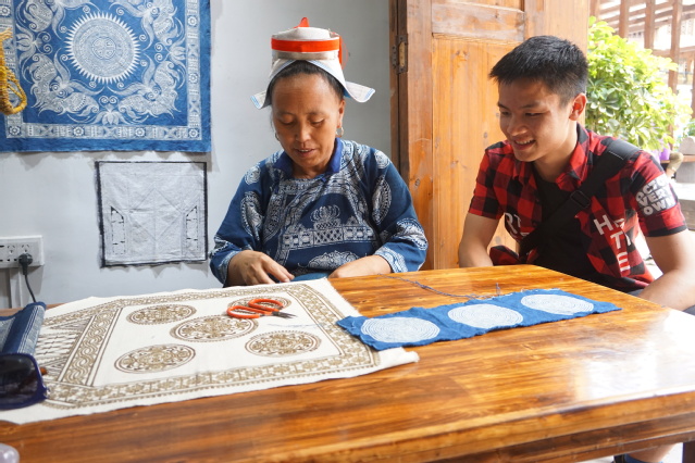 8月11日,实践团到达下司古镇后,实践活动有序展开。走在幽深的石板路上,队员们对于古镇的历史文化和匠人的传统手工有了更深的认识。下司古镇位于贵州省黔东南州清水江畔,自清代以来就一直是清水江上游的商阜重镇,曾被人誉为“小上海”,有“清水江上的明珠”之美称,这里世代居住着苗、仫佬、畲等少数民族。许多地区的汉文化通过商运与当地的少数民族文化相融合,呈现出绚丽多彩的文化景观。队员们来到古镇的商业街,走进一家家手工打造银饰的店和苗族服饰店参观,在参观过程中看到了苗族的蝴蝶妈妈在银饰和刺绣上绣出的绚丽图案。在古镇非遗街道的一家蜡染作坊里,大家看到各种蓝白相间的民族纹饰被绣娘娴熟地展现出来。最后,队员们参观了精美的手工艺品并与手工艺人交谈,进一步了解了其中的奥秘。