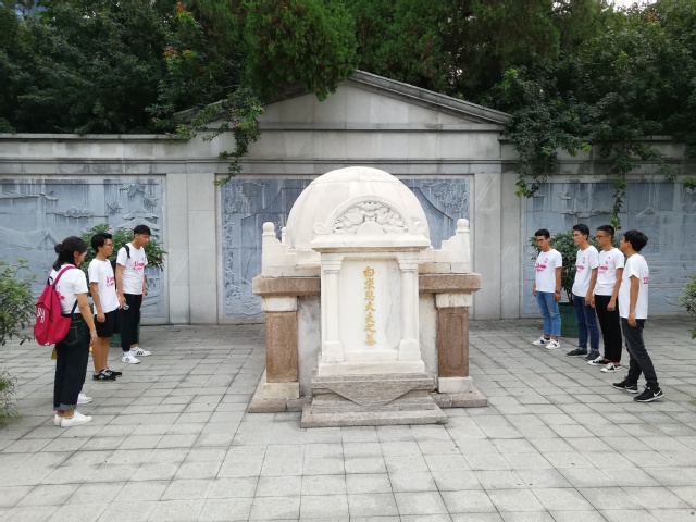 实践团队来到坐落于石家庄华北军区烈士陵园内的白求恩墓,首先实践团队成员怀着敬畏之心瞻仰了墓前广场的白求恩全身塑像。再往后走,就是白求恩墓了,花岗石墓基,墓顶为半圆型,墓前有汉白玉墓碑,上刻“白求恩大夫之墓”,两侧长廊有白求恩革命活动照片。白求恩同志是加拿大共产党员,五十多岁了,为了帮助中国的抗日战争,受加拿大共产党和美国共产党的派遣,不远万里,来到中国。1939年在五台山工作时,不幸因病逝世。