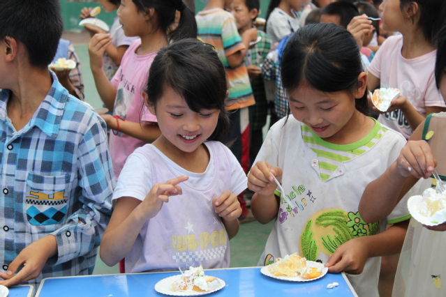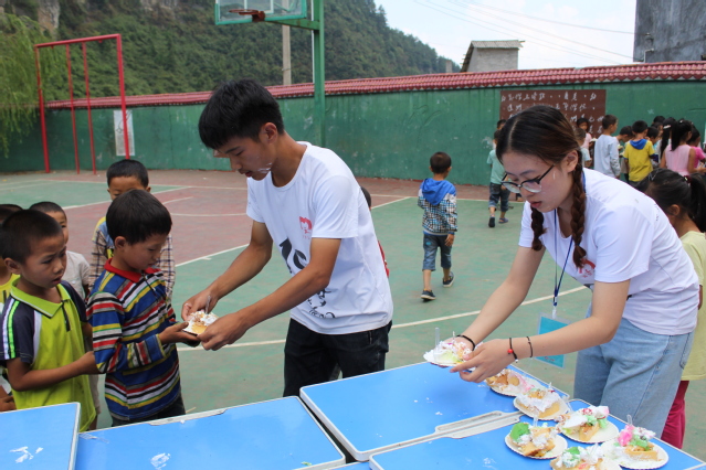 上午10:30,支教队员们开始布置活动场地、切分蛋糕。上午11:05,所有孩子在担任班主任的支教队员带领下有序的在操场上集合,集体生日正式开始。首先,支教队员们带领孩子们唱生日歌并为自己许下愿望。随后支教队员们将切好的蛋糕分发给每个孩子,操场上充满了孩子们的欢呼声,孩子们开始品尝蛋糕,有些调皮的孩子将蛋糕上的奶油抹在同学的脸上,其他的孩子们也开始了刺激的“奶油大战”,有些孩子甚至大胆的往自己喜爱的支教队员的脸上涂抹奶油。最终,集体生日在孩子们的欢笑声中步入了尾声,支教队员们将温州商会提供的文具发给孩子们作为生日礼物。永胜小学的孩子们大多为离异、留守儿童,他们小小年纪就要肩负起生活的压力,想要过一次自己的生日那更是奢望,看似小小的蛋糕,却能让他们开心许久。