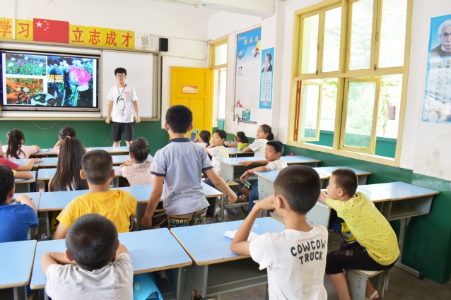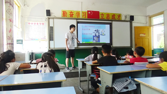 在“禁毒防艾”课程展开之前,支教队员们做足了准备,他们对艾滋病传染及防护方法进行深入了解和学习,并根据所学的知识,精心准备了课件和调查表。8月7日上午,“禁毒防艾”课程正式开始,支教队员采用多媒体课件展示的方式,生动形象地向学生们讲解了艾滋病相关知识以及毒品相关危害,并向学生展示了艾滋病的具体防护措施。在学生了解了禁毒防艾相关知识后,支教队员将禁毒防艾调查表分发,让孩子们填写,以便更好地了解贵州当地关于禁毒防艾行动的进展状况。调查表填写完毕后,支教队员又根据之前了解到的当地水资源情况,向学生们展示了水资源的健康小贴士。至此,“禁毒防艾”课程结束。