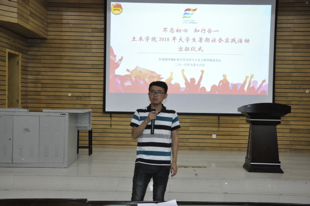 晚上18:00,仪式正式开始。首先,游洋老师发言,他向同学们讲到:“社会实践是一项非常有意义的活动,值得所有的同学积极参与并认真对待。”随后,他就学院本学年的暑期社会实践项目申报情况向大家做了一个简单的汇报。紧接着,游洋老师开始具体安排暑期社会实践活动的各项事宜,他从人身安全、项目报备与实践工作这三个方面进行统筹安排,他重点强调了要树立安全意识,遵守校规校纪和社会治安管理规定,加强团队协作,把生命健康放在首位。对于社会实践活动的经费报销问题,游洋老师希望大家不要过于重视资金问题,而更应该考虑如何做好社会实践。最后,游洋老师希望所有同学在本次社会实践活动中不仅要做出成绩,更要体现出土木学子的风采。
